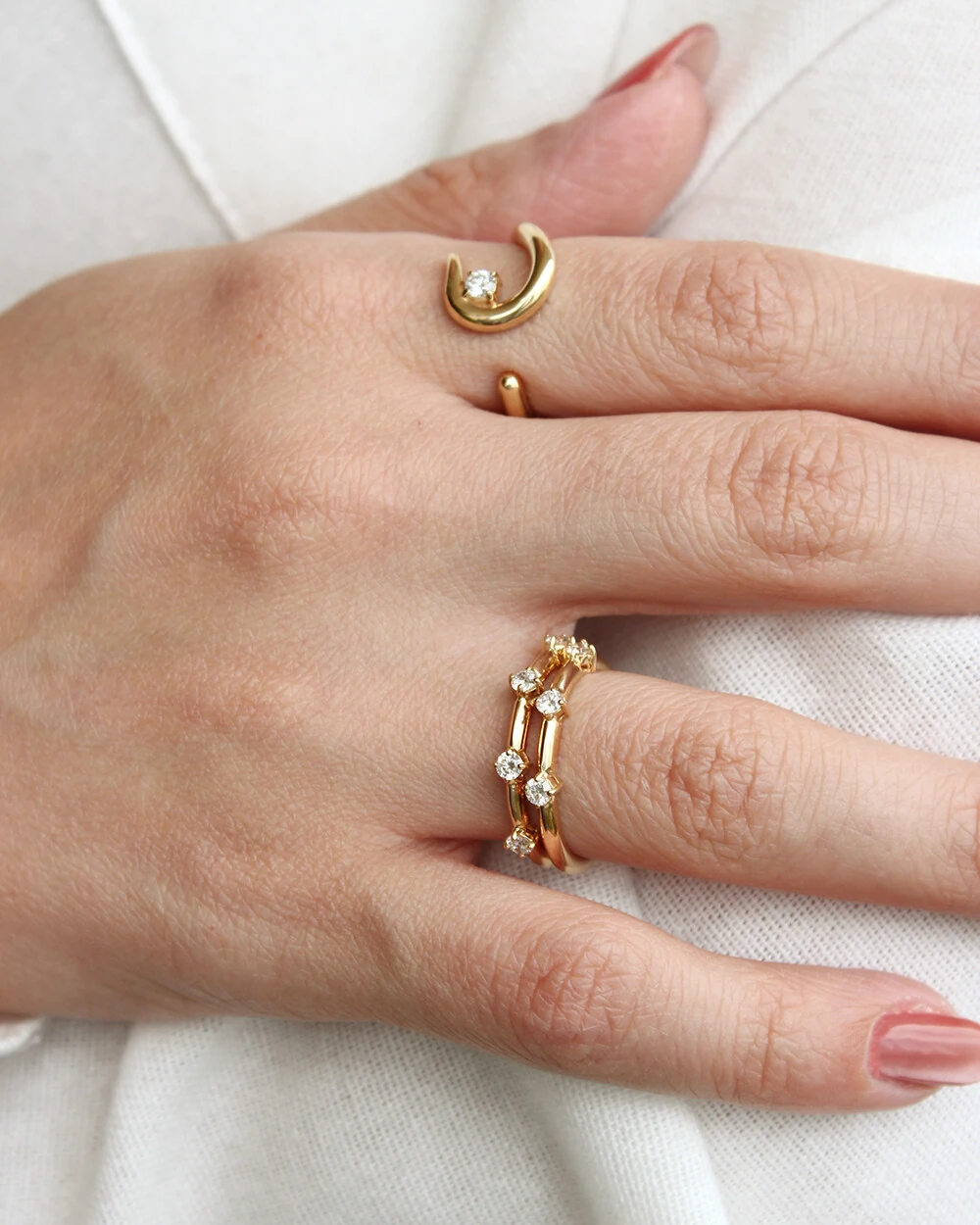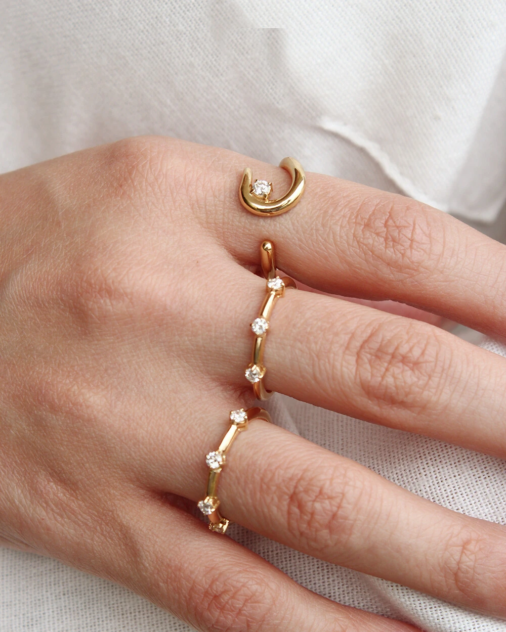 Seu design minimalista e elegante remete à delicadeza de uma aliança, trazendo como destaque quatro diamantes espaçados, que trazem brilho e harmonia.