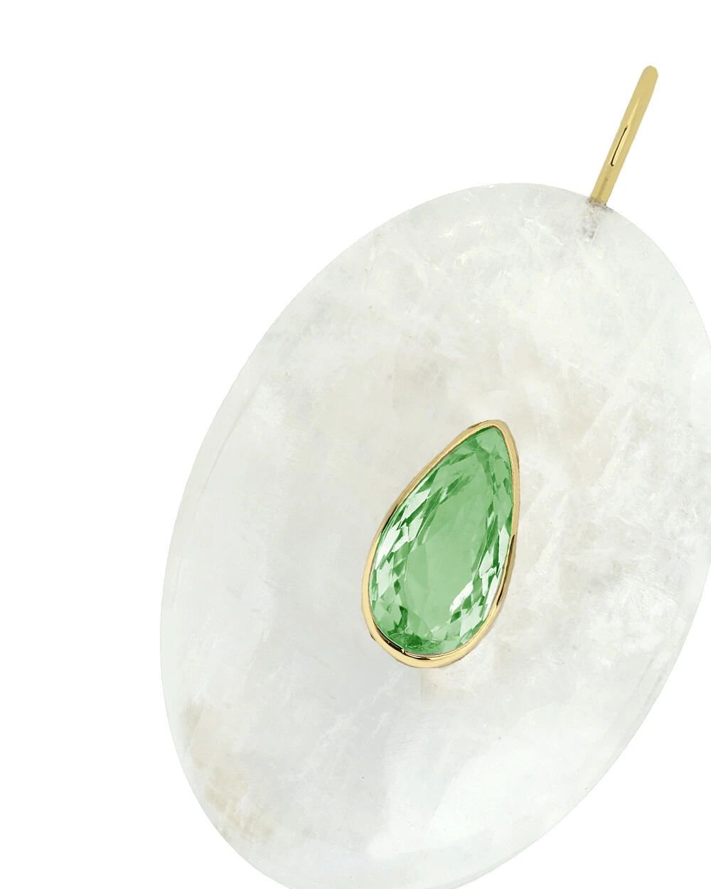No centro, a esmeralda colombiana em formato de gota arredondada adicione um toque de cor, com seu verde inconfundível e vibrante, criando um contraste fascinante com a suavidade luminosa da pedra da lua.