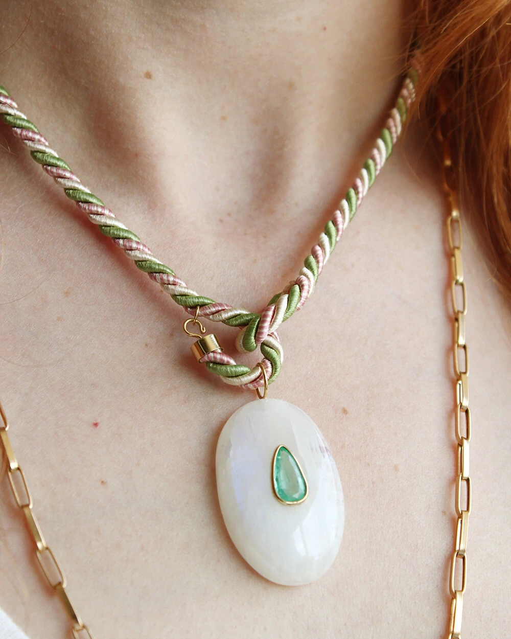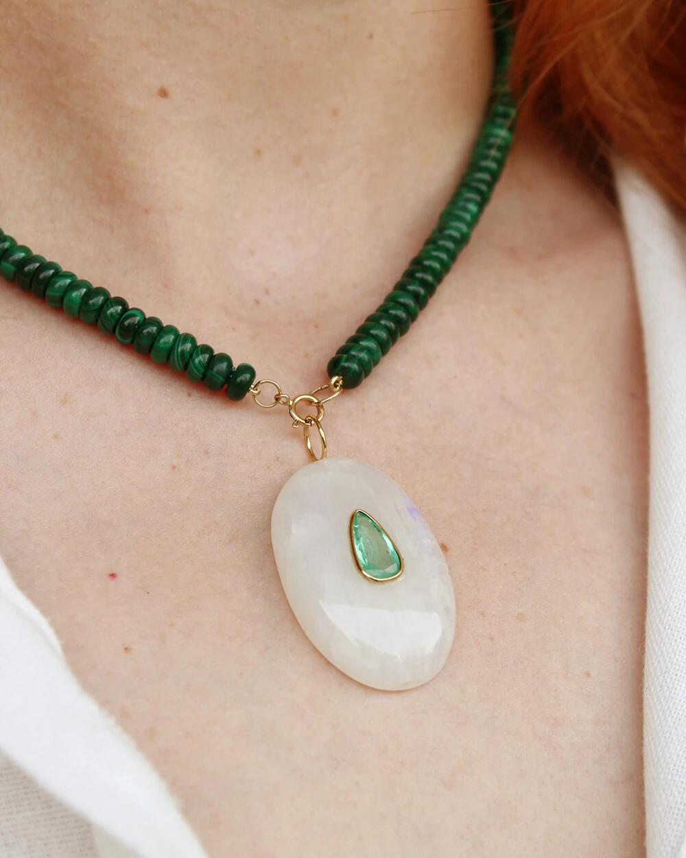 O pingente pedra da lua com esmeralda colombiana une a luminosidade etérea da pedra da lua com a intensidade única da esmeralda colombiana. A pedra da lua reflete um brilho sutil e encantador, com reflexos suaves e translúcidos que revelam sua delicadeza natural.