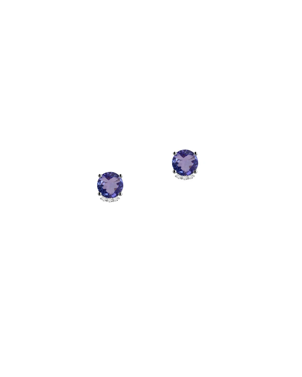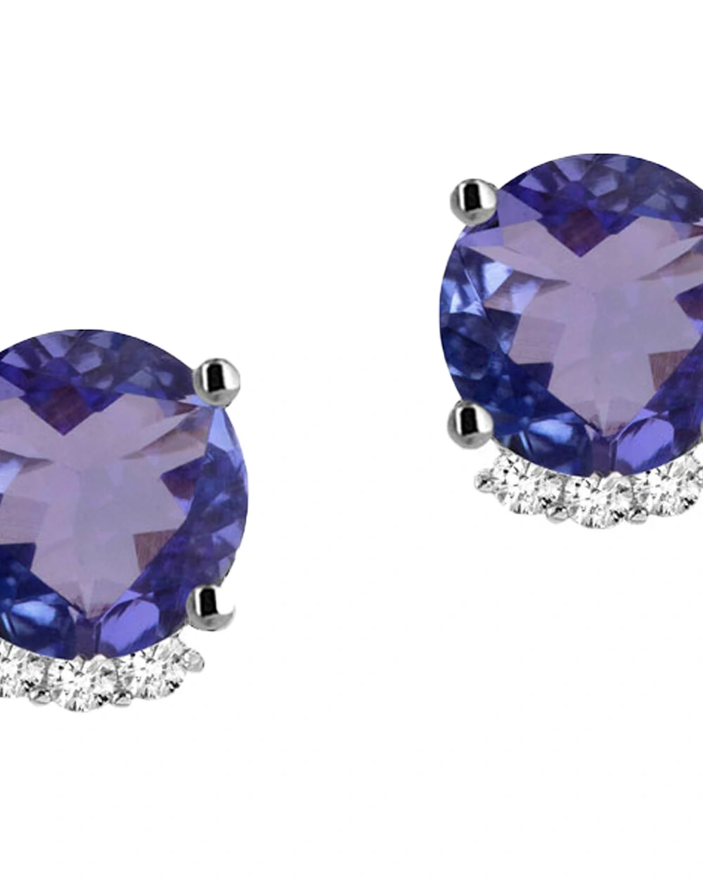 Cada brinco apresenta uma tanzanita em formato redondo, revelando tonalidades únicas de azul com reflexos violáceos, realçada por três delicados diamantes que valorizam ainda mais sua beleza.