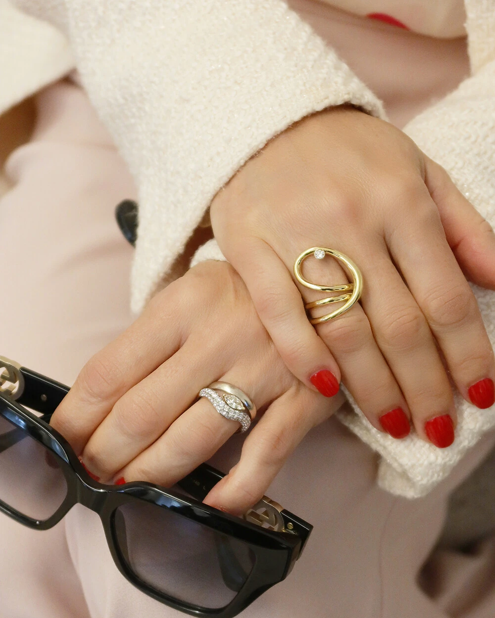 Sua estrutura curva envolve delicadamente o dedo, criando um efeito elegante e ergonômico que valoriza a anatomia da mão.