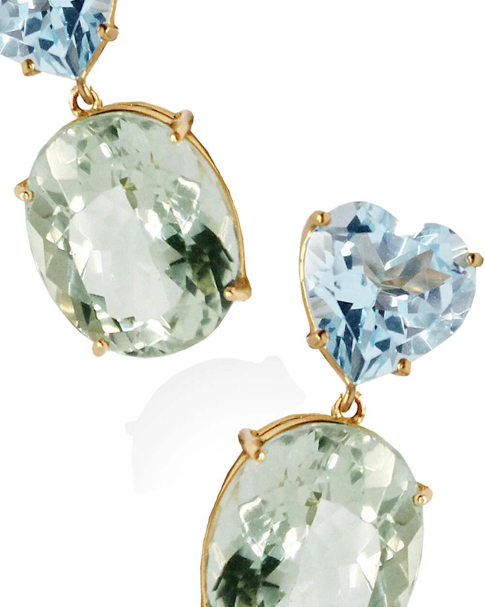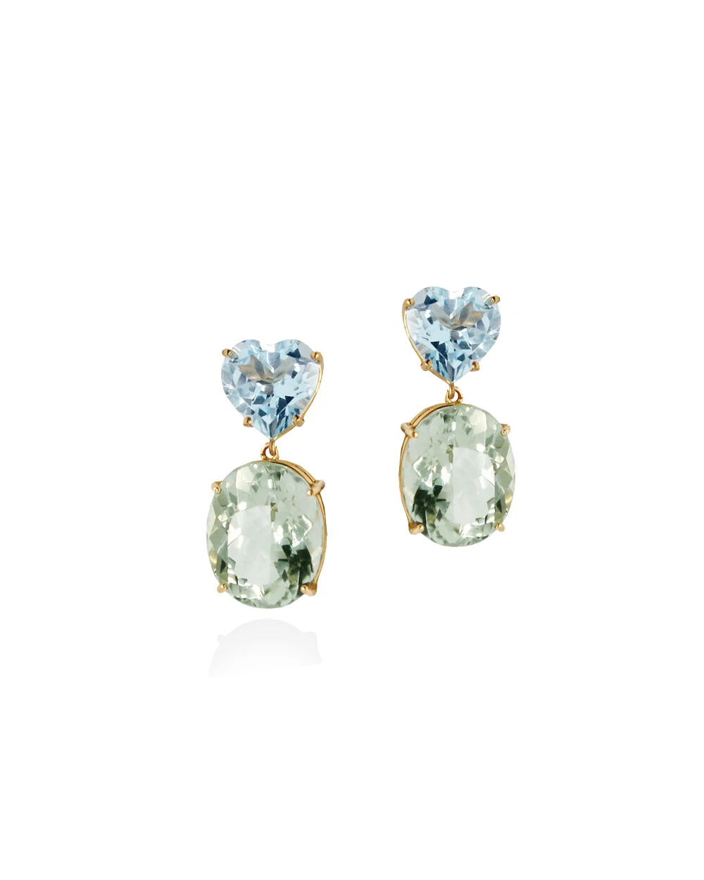 Brinco em ouro 18k com prasiolita e topázio azul, uma joia delicada e sofisticada que combina formas e cores com harmonia. A prasiolita em lapidação oval traz leveza e transparência, enquanto o topázio azul em formato de coração adiciona romantismo e um toque de originalidade ao design.