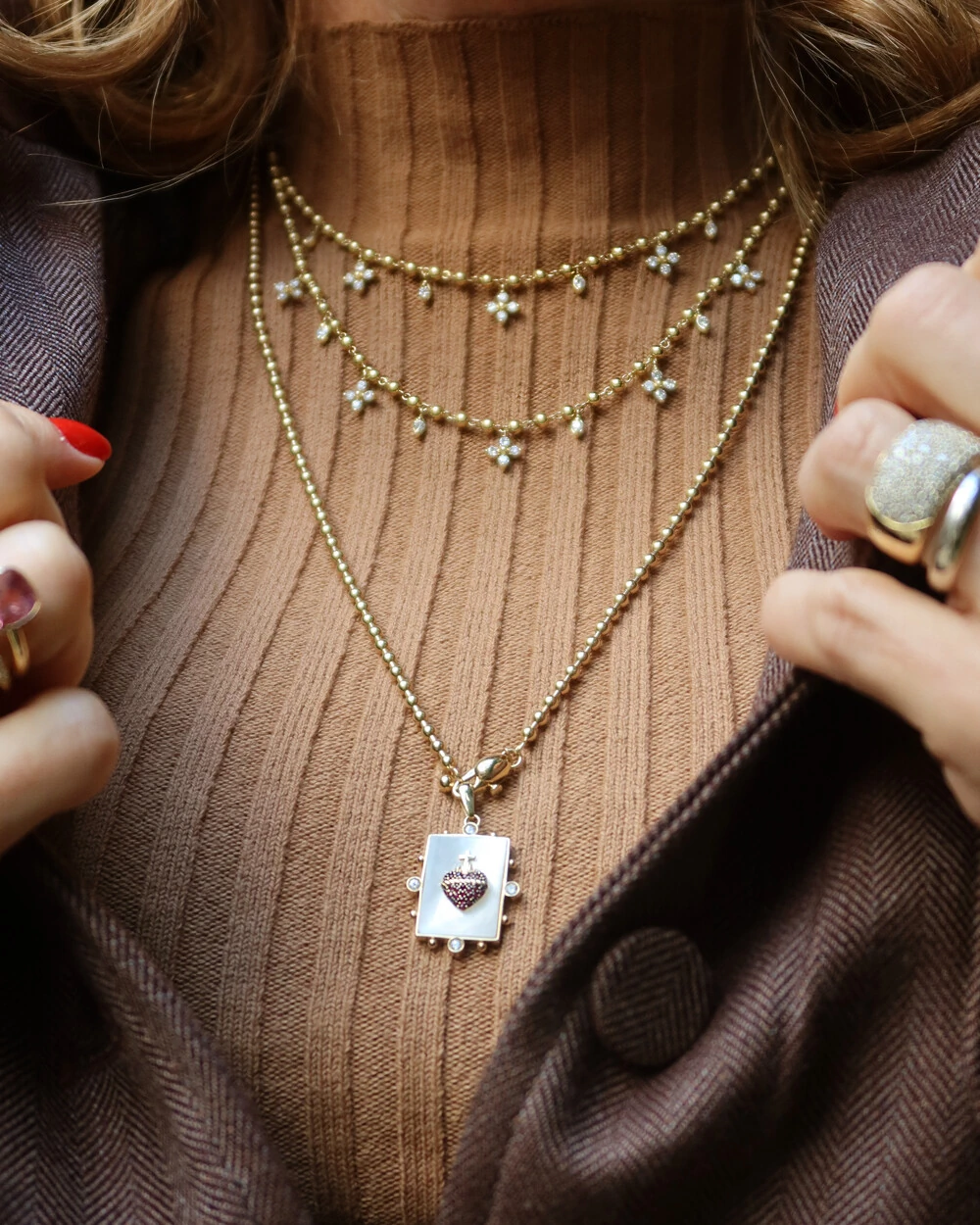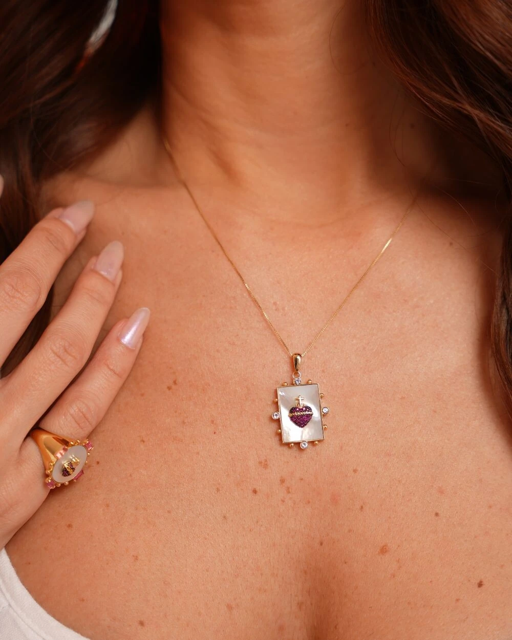 O pingente de formato retangular traz ao centro uma base de madrepérola, que ilumina o design com seu brilho natural e suave. O Sagrado Coração é ricamente cravado com rubis, representando amor e proteção, e ganha destaque com delicados detalhes em ouro que completam sua expressão sagrada.