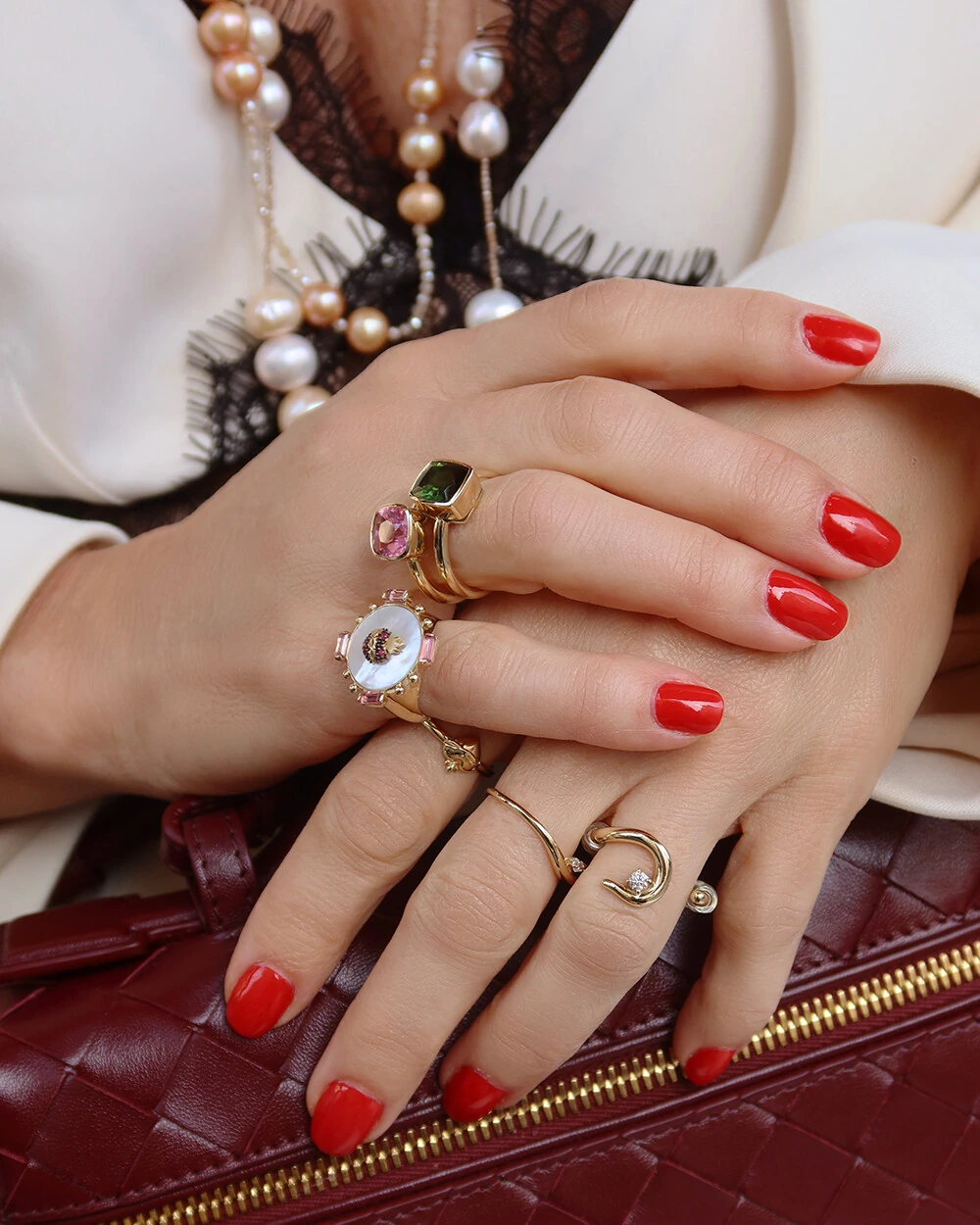 O Anel Dedinho Madrepérola Sagrado Coração é uma joia delicada e cheia de significado. Possui formato redondo com base em madrepérola que reflete suavidade e luminosidade. No centro, o Sagrado Coração é representado em rubis cravados, irradiando cor e simbolismo.