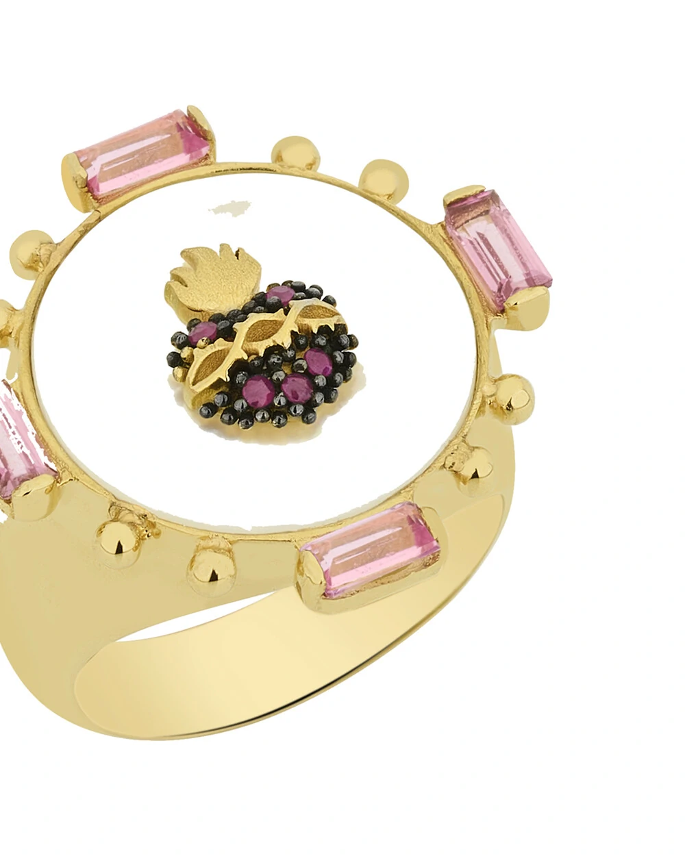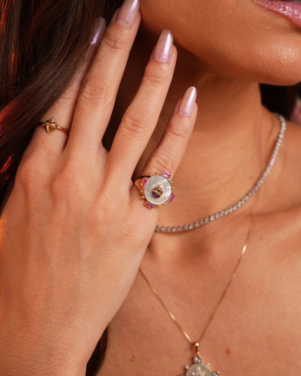 Quatro turmalina rosa em lapidação baguete adornam as laterais, criando um contraste encantador entre tons suaves. Pequenas bolinhas de ouro, dispostas de forma espaçada ao redor do anel, completam o design com um toque artesanal e harmônico.