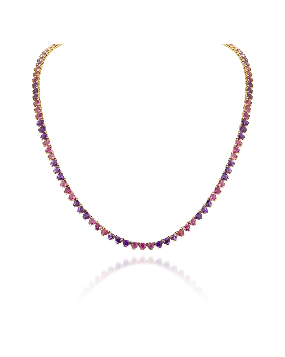 Romântico e delicado, o Colar Riviera Corações Ametista e Turmalina Rosa encanta pela harmonia entre as cores suaves do roxo e do rosa. A combinação das pedras cria um efeito luminoso e feminino, que transmite leveza e elegância.