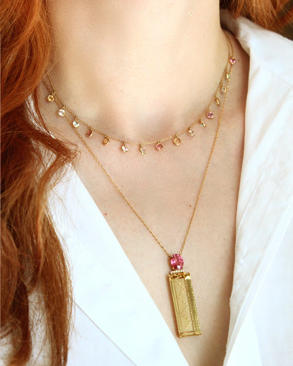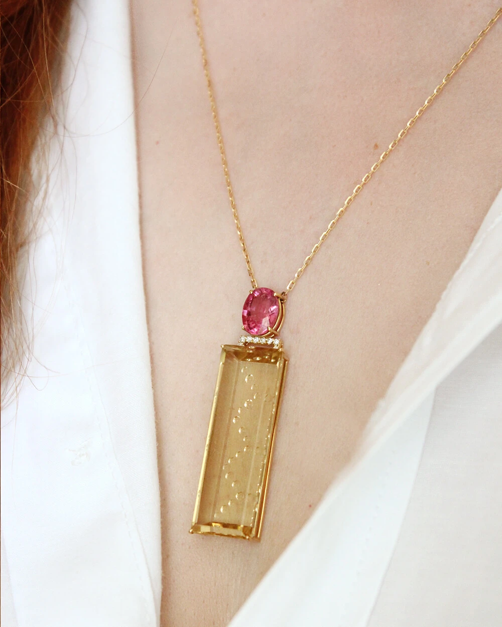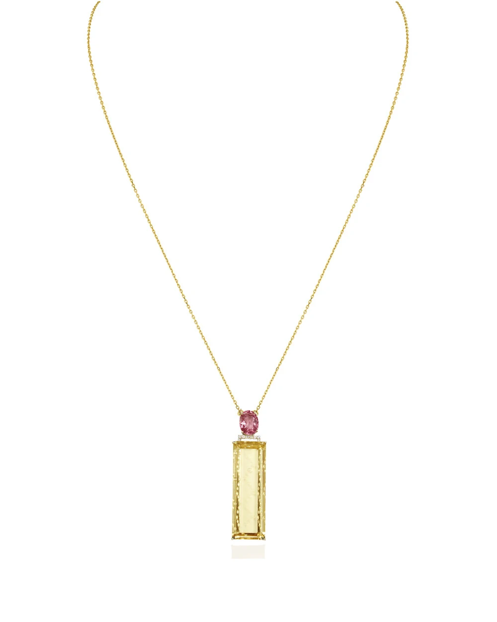 Um colar sofisticado e cheio de personalidade. O pingente combina uma turmalina champanhe retangular com uma turmalina rosa circular, unidas pelo brilho sutil de um diamante brown, criando um contraste elegante e inusitado.