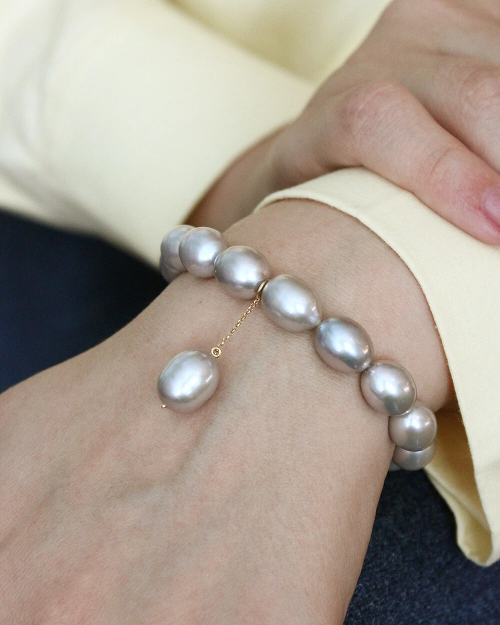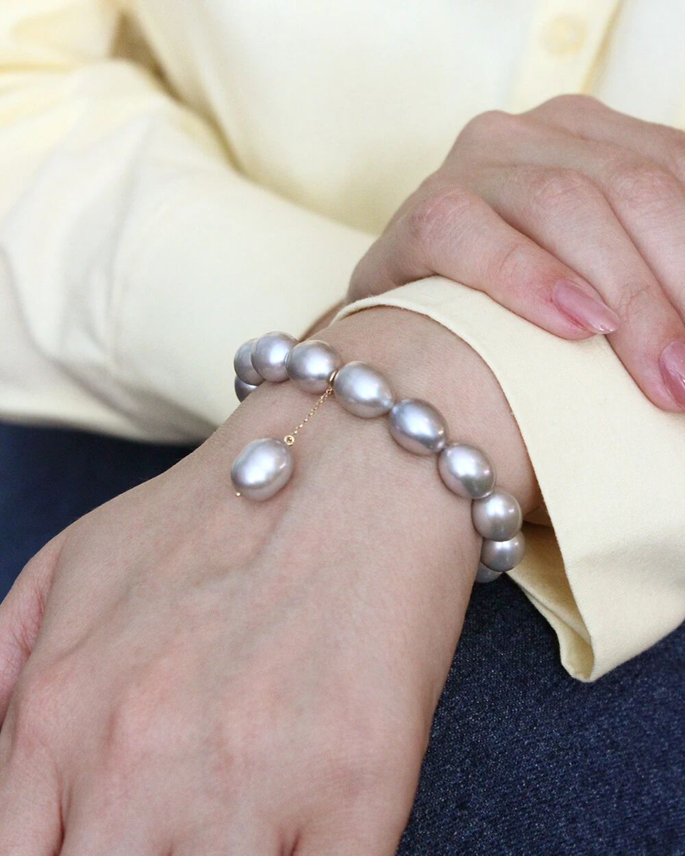 A pulseira de pérolas com pingente é um verdadeiro clássico atemporal. Suas pérolas em tom de cinza apresentam um brilho sofisticado e singular, revelando nuances suaves que realçam ainda mais sua elegância natural