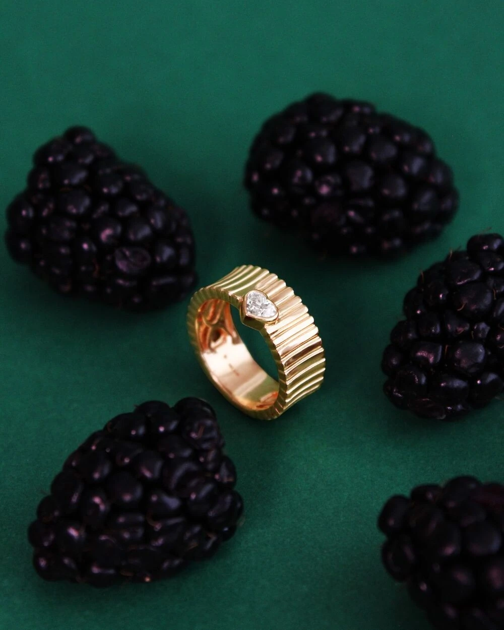 Anel com detalhes em filetes ao longo do aro, criando textura e refinamento em cada traço. Ao centro, um delicado coração de diamante adiciona um toque de luz discreta e simbolismo, trazendo ao design uma aura romântica e atemporal.