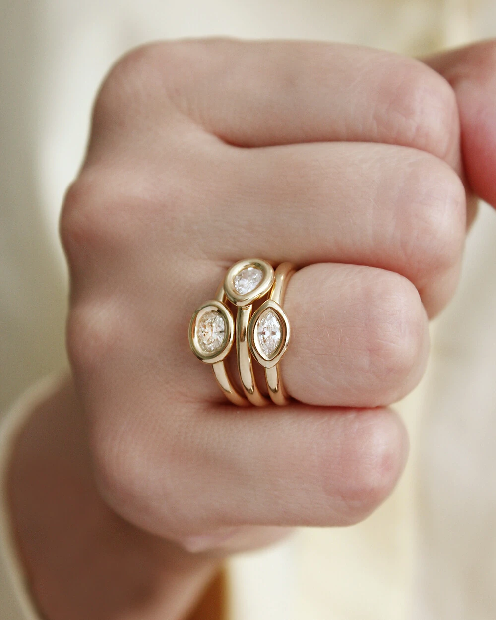 Anel em cravação inglesa com diamante oval, uma joia delicada que combina sofisticação e leveza. Seu design minimalista realça a beleza do diamante, destacando o brilho natural da pedra de forma elegante e discreta.