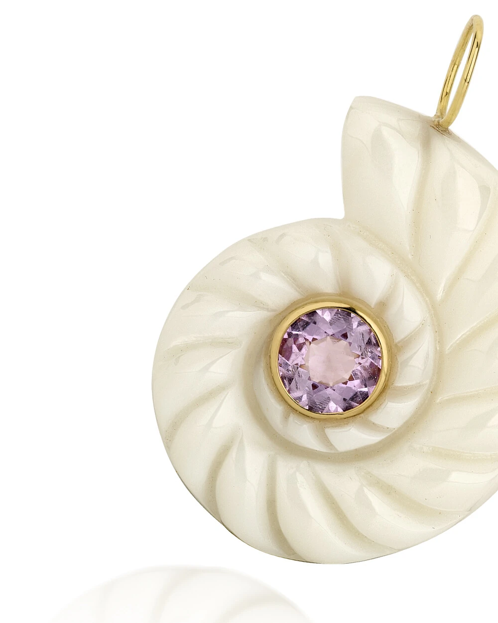 Pingente de madrepérola esculpido em formato de concha caracol, uma peça delicada que revela um brilho suave e um charme natural. No centro, um detalhe de ametista adiciona cor, profundidade e um toque de sofisticação ao design orgânico da madrepérola.