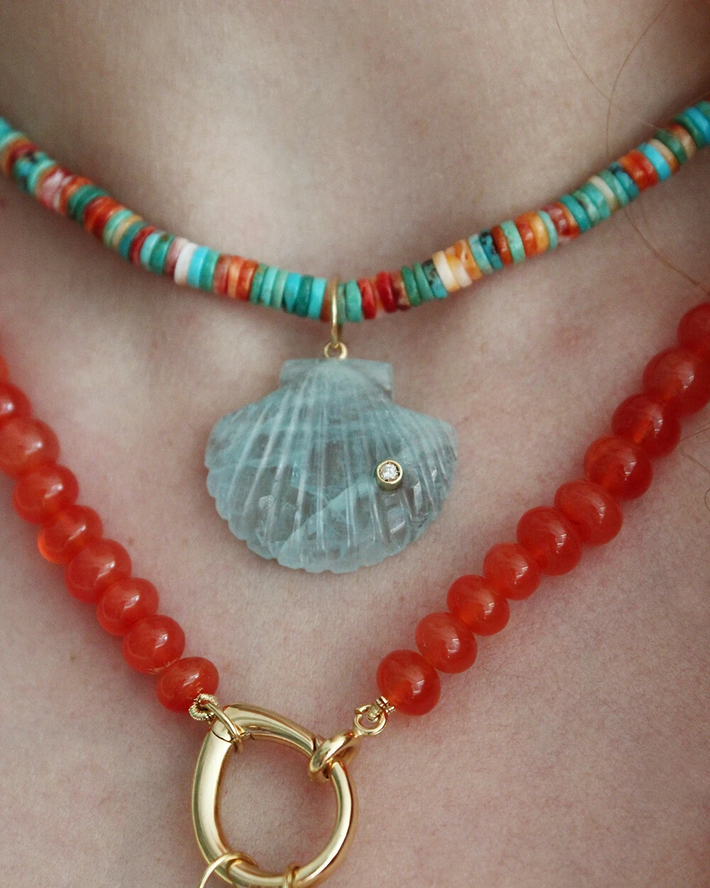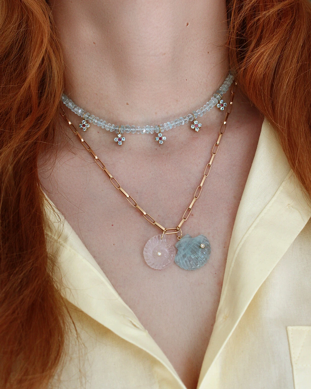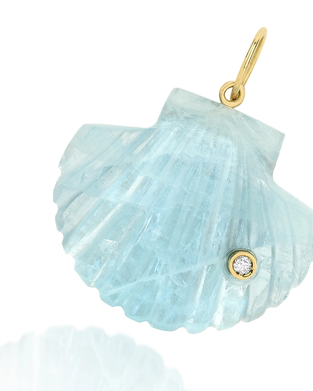 Pingente de concha com água-marinha e diamante, uma peça que une frescor, delicadeza e brilho em um design inspirado no universo marinho.