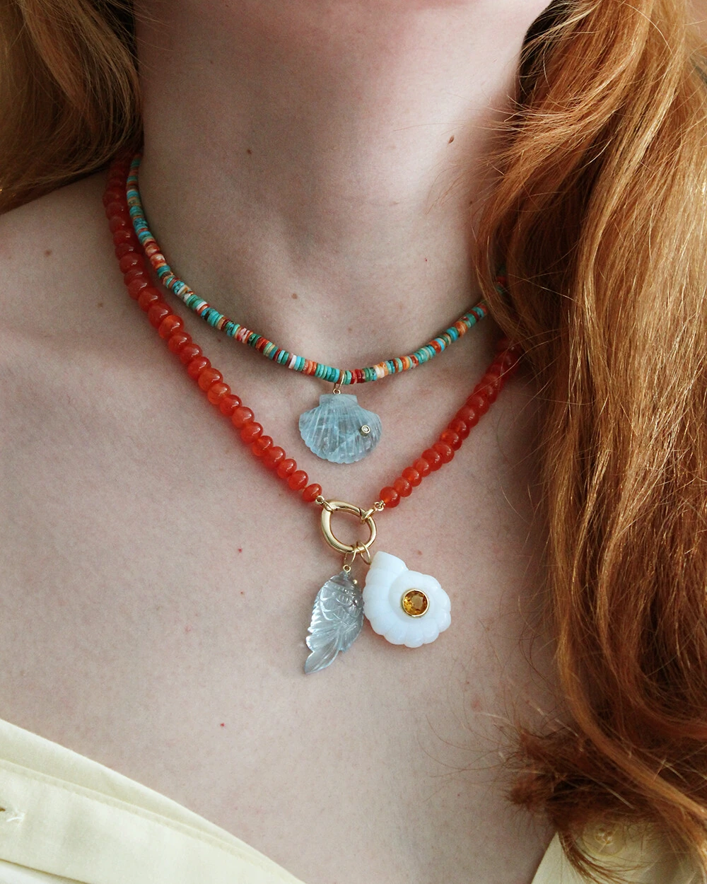 Pingente de opalina esculpido em formato de concha caracol, uma peça delicada que revela um brilho suave e um charme natural. No centro, um detalhe de citrino adiciona cor, profundidade e um toque de sofisticação ao design.