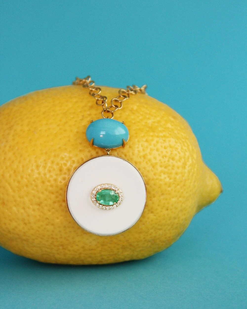 Colar com corrente de elos redondos em ouro e pingente de placa em ágata. No centro da peça, uma esmeralda ganha destaque, emoldurada por uma delicada volta de diamantes que realça ainda mais seu brilho e sofisticação. Acima do pingente de ágata, uma turquesa oval complementa o design, adicionando um toque de cor e personalidade.
