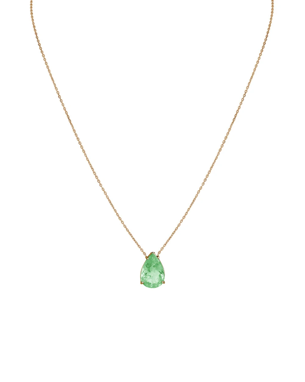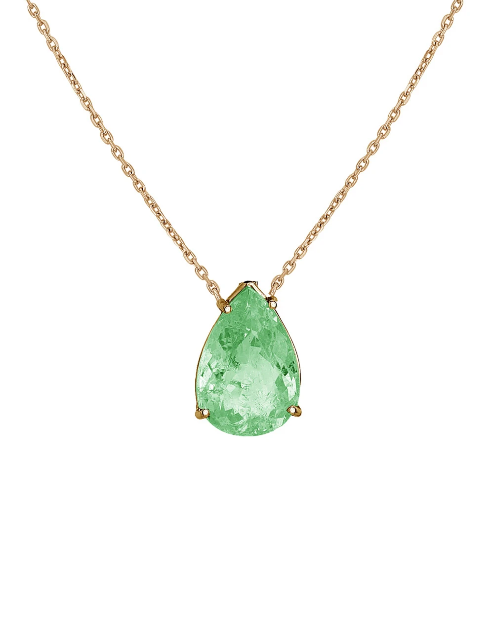 Elegante e sofisticado, este colar com pingente de esmeralda em formato de gota, em ouro amarelo, é uma peça única, imponente e clássica.