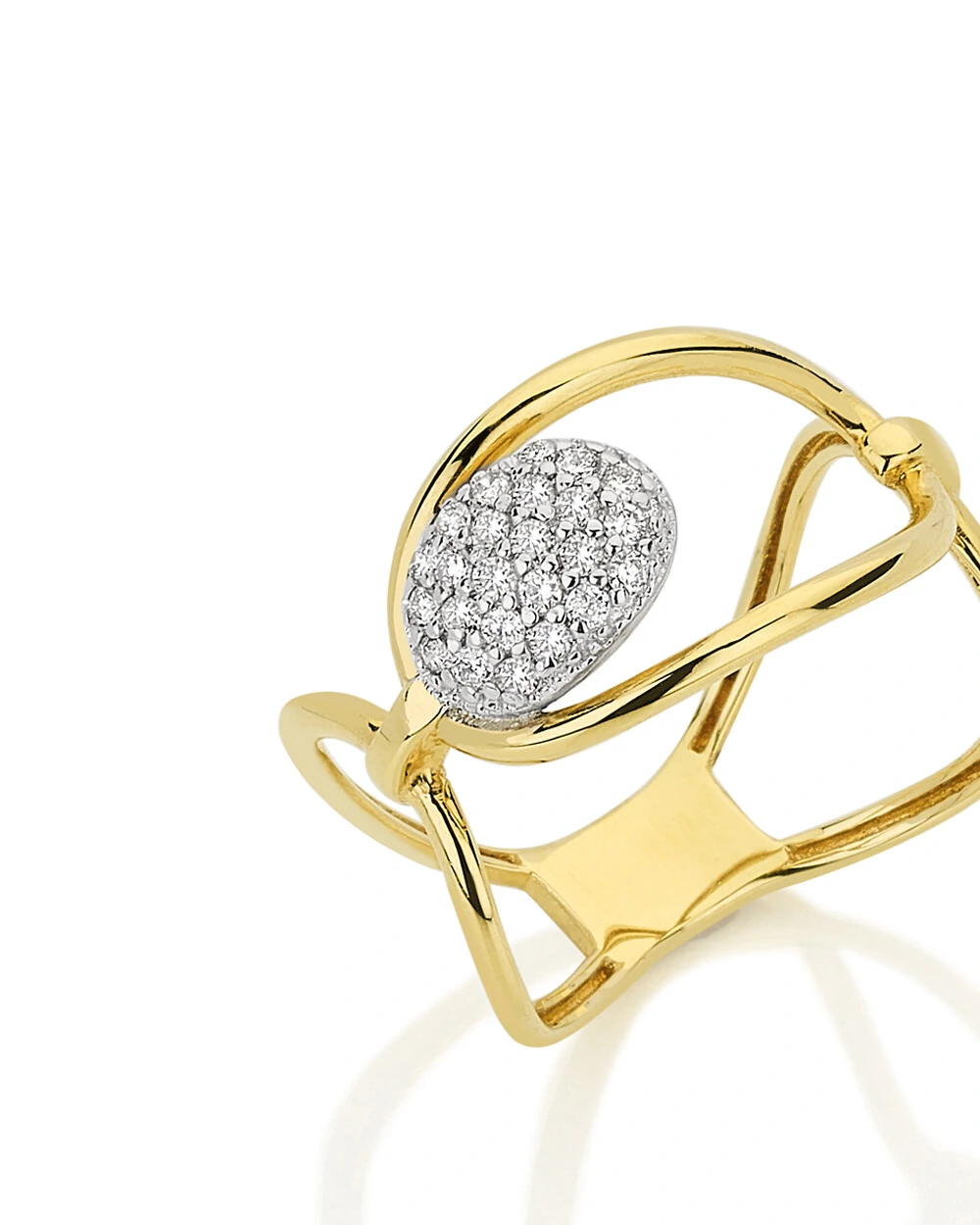 Um anel moderno com linhas vazadas que criam movimento e envolvem o dedo de forma elegante.