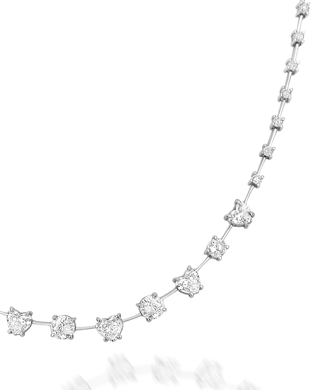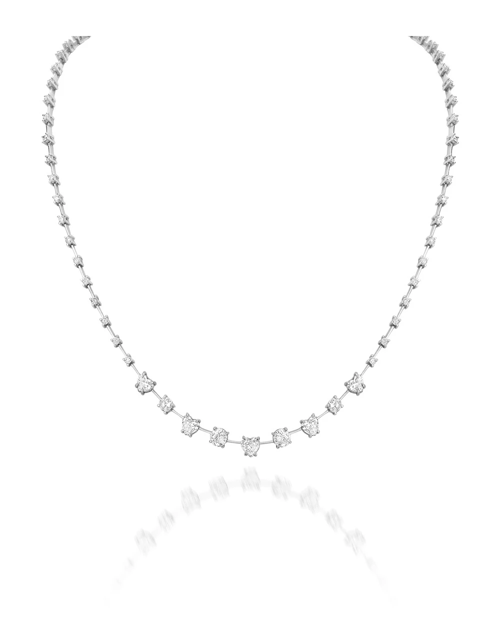Colar riviera com diamantes em lapidação alternada em formato de coração e lapidação clássica, confeccionado em ouro branco 18k, que traduz delicadeza e sofisticação em cada detalhe.