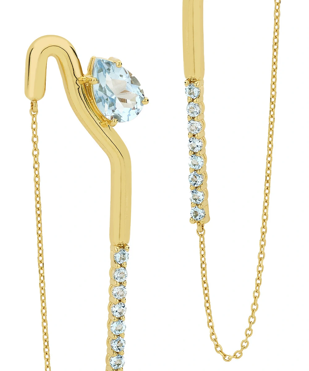 O destaque fica por conta da gota de topázio azul no topo e da delicada cravação de topázios menores na base, que acrescentam pontos de cor e brilho na medida certa, trazendo luminosidade e refinamento à peça. Como toque moderno, a correntaria que envolve o brinco adiciona movimento, textura e um charme atual e delicado.