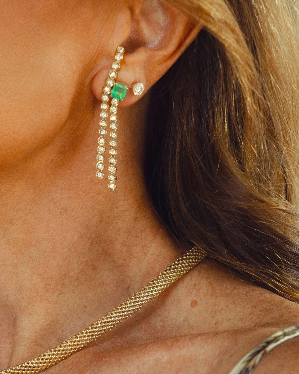 O contraste entre a intensidade da esmeralda e a luminosidade dos diamantes traz profundidade à peça, enquanto o design leve valoriza o rosto com feminilidade e delicadeza.