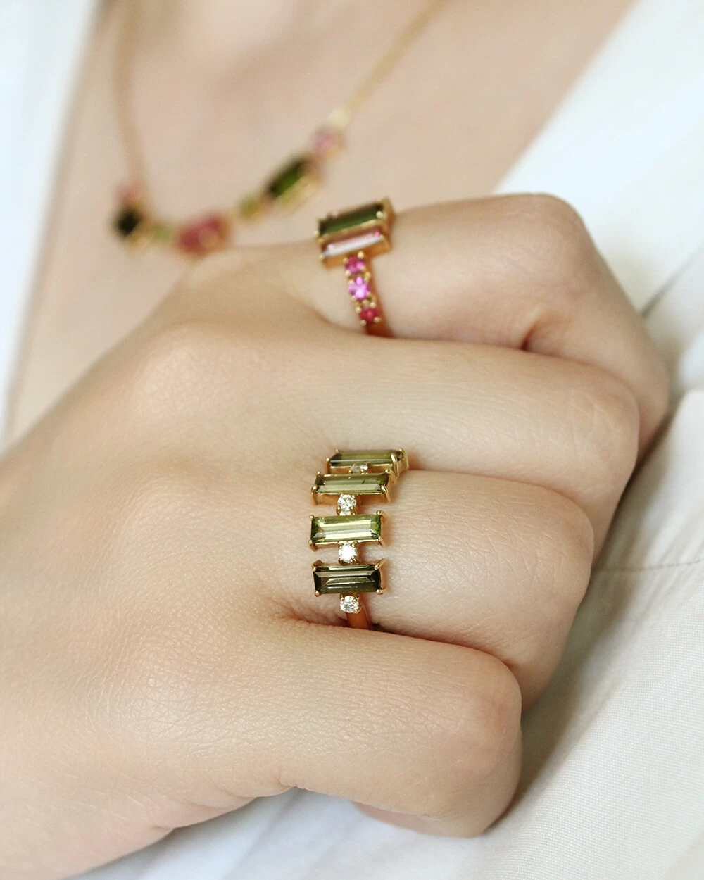 A elegância geométrica e brilho natural definem este anel. Composto por turmalinas verdes em lapidação baguete, que criam um visual sofisticado e moderno. Entre cada pedra, delicados diamantes cravejados adicionam brilho sutil e refinamento, valorizando ainda mais a composição.