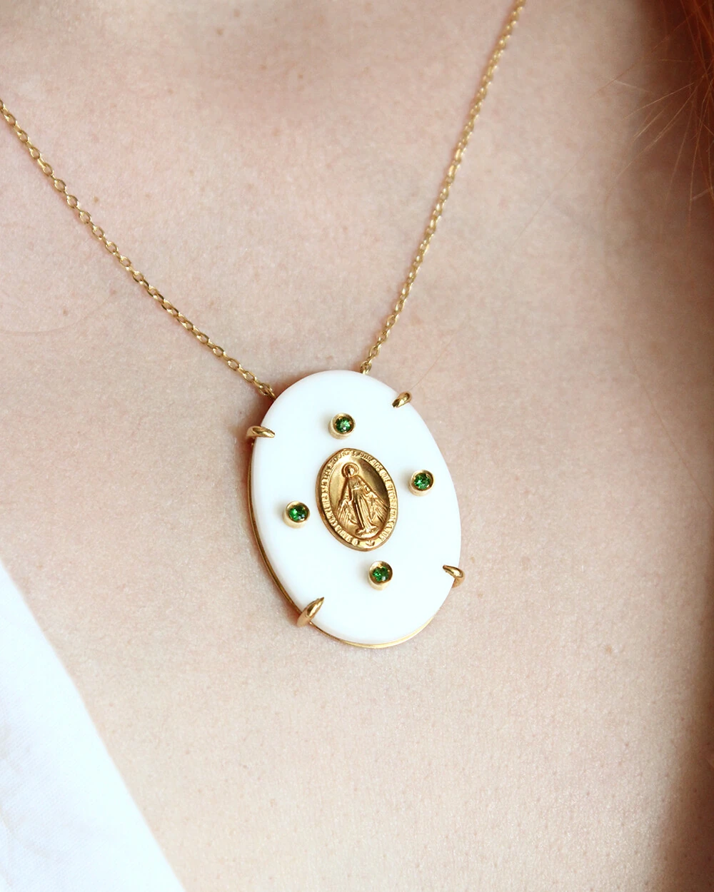 Colar Nossa Senhora das Graças, com medalha lapidada no centro de uma ágata branca, adornada com quatro peridotos que acrescentam um toque vibrante e luminoso à composição.