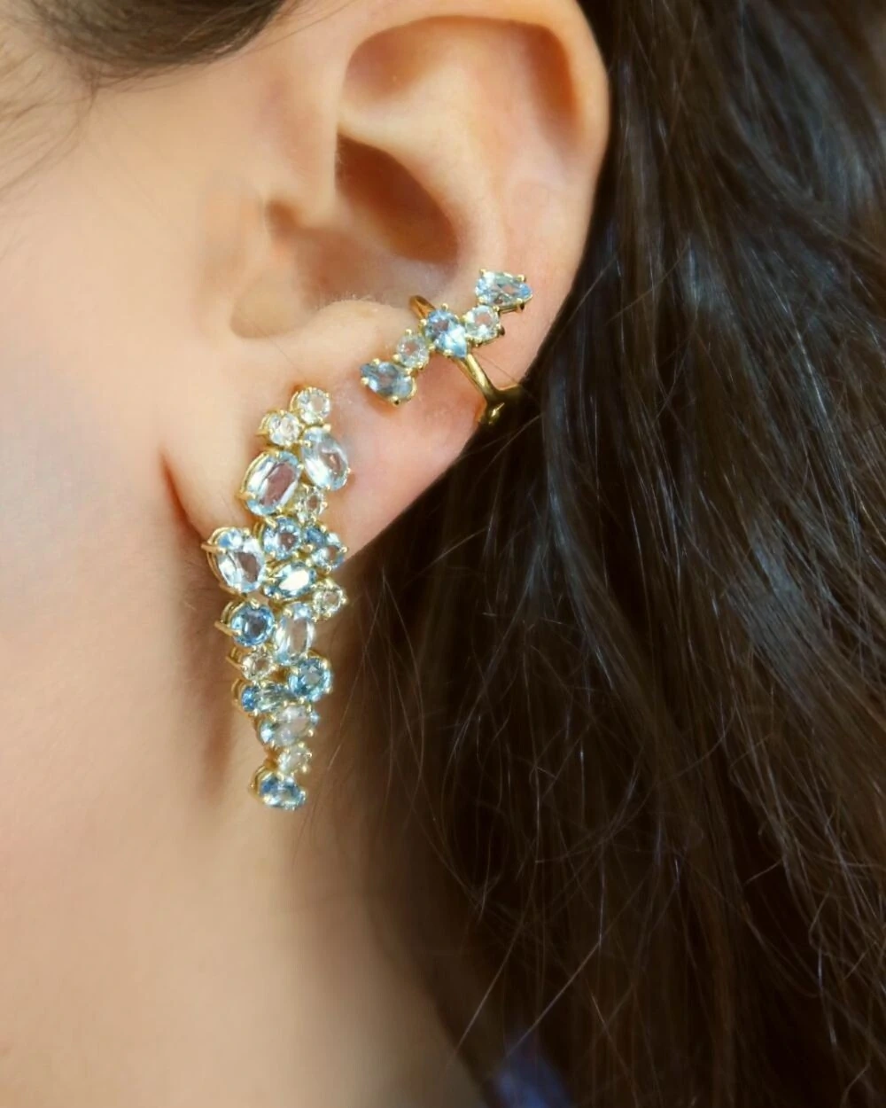 As pedras de topázio azul, conhecidas por sua tonalidade intensa e luminosa, criam um efeito de movimento delicado que valoriza o visual com frescor e sofisticação.