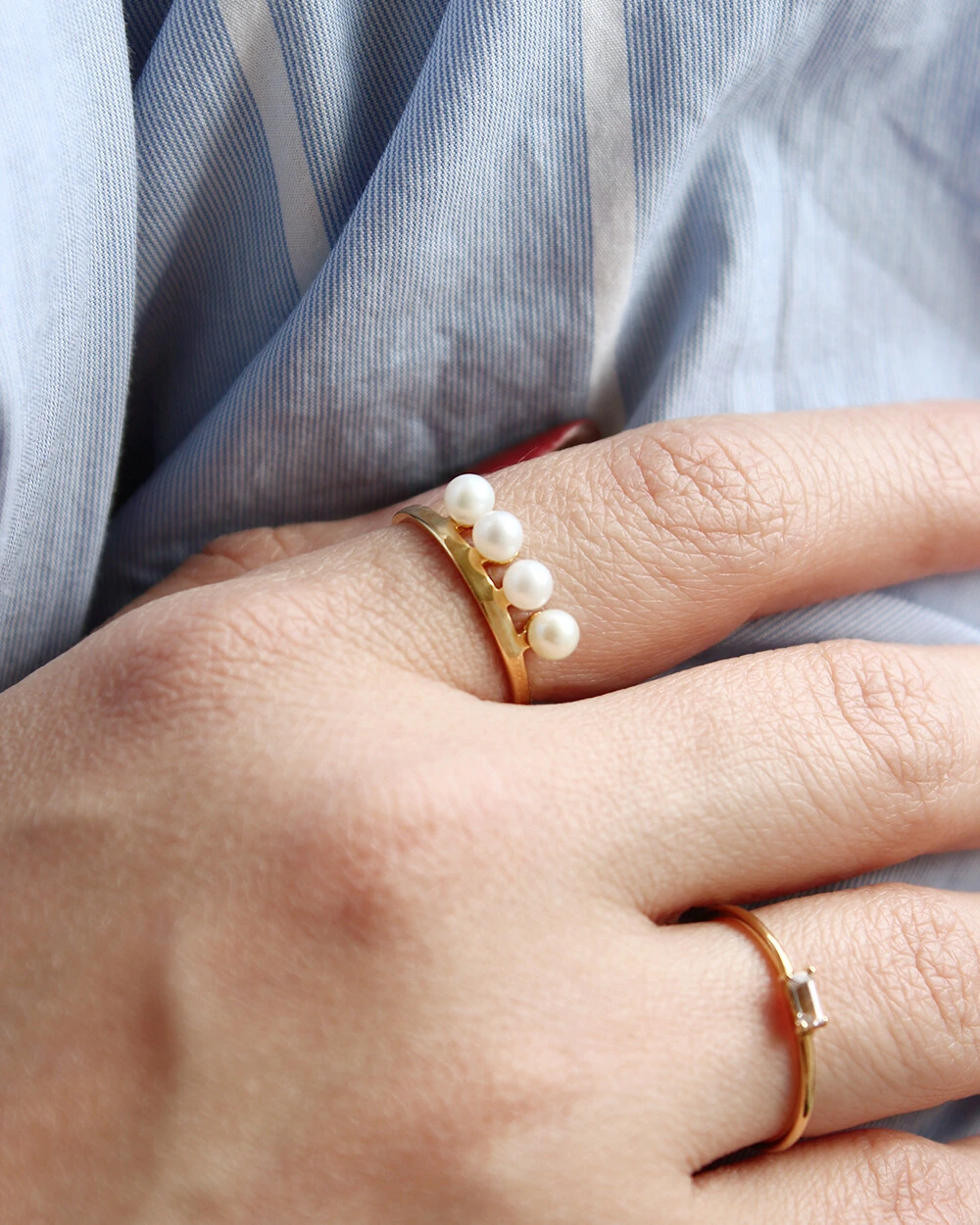 Um anel delicado e romântico, feito em ouro amarelo 18k. O destaque da peça fica por conta de quatro pérolas naturais, que adicionam um toque clássico e feminino, criando uma harmonia perfeita entre o charme discreto e a elegância tradicional.