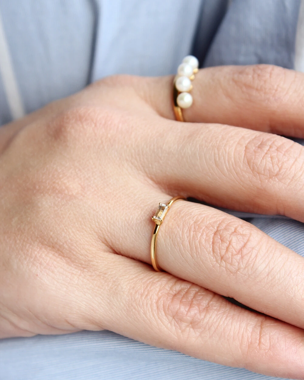 O quartzo rosa, conhecido como a pedra do amor e da harmonia, traz suavidade e feminilidade ao design, enquanto o corte baguete confere modernidade e linhas limpas. Minimalista e versátil, o anel pode ser usado sozinho como ponto de luz ou combinado com outros modelos para compor um mix cheio de estilo e personalidade.