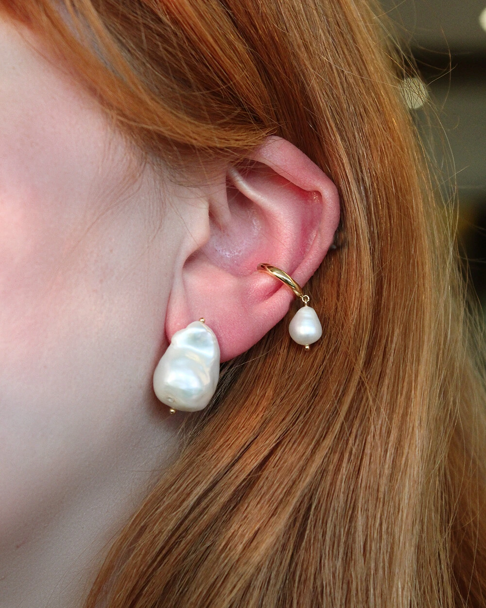 O Piercing Gota Pérola combina a delicadeza do ouro amarelo com a beleza singular da pérola barroca, cujas formas orgânicas e brilho suave tornam cada peça única.